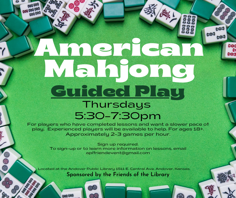 nterested in playing American Mahjong? Now you can come to the library every week to play! No registration required. For experienced players. For ages 18+. Mahjong is every Wednesday 12:30-3:30 Presented by the Friends of the Library Email aplfriendevent@gmail.com for information on lessons